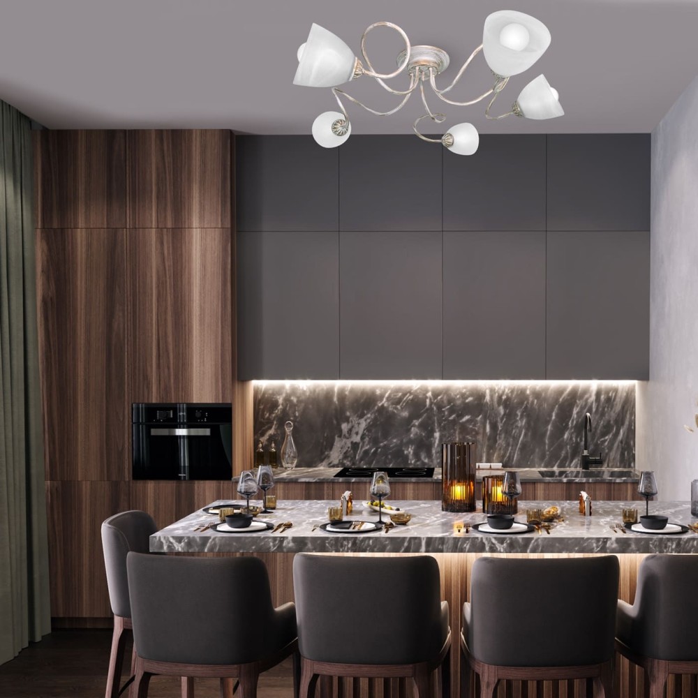 Люстра потолочная 5 плафонов S2495-5 – Изысканный Классический Осветитель для Вашего Дома Эта роскошная люстра потолочная S2495-5 от бренда Петрасвет станет настоящим украшением вашего интерьера, создавая атмосферу уюта, тепла и элегантности. Разработанная с учетом последних тенденций в дизайне освещения, эта люстра сочетает в себе классическую красоту и современный функционал. Идеально подходит для гостиной, столовой, спальни или другого помещения, где вы хотите подчеркнуть статус и создать неповторимую атмосферу. Основные характеристики и преимущества: Дизайн: Люстра S2495-5 воплощает в себе идеальное сочетание стилей – классики, неоклассики и прованса. Использование благородного металла, покрытого патиной золота, придает светильнику винтажный шарм и придает ощущение роскоши. Белый цвет плафона гармонично сочетается с золотистым оттенком, создавая элегантный и изысканный вид. Плавные линии и тщательно продуманная конструкция придают светильнику особую привлекательность. Материалы: Люстра изготовлена из высококачественного металла, что обеспечивает ей прочность и долговечность. Плафоны выполнены из стекла, обеспечивающего отличную светопроницаемость и рассеивание света. Использование только качественных материалов гарантирует, что люстра прослужит вам долгие годы. Размеры: Ширина светильника – 86 см, высота – 25 см. Размеры коробки: 18 x 56 x 56 см, что обеспечивает удобство транспортировки и хранения. Количество плафонов: 5 плафонов обеспечивают равномерное освещение помещения и создают приятную атмосферу. Тип цоколя: Е27 – стандартный цоколь, который позволяет использовать лампы накаливания, светодиодные и люминисцентные лампы. Световой поток: 6750 люмен – достаточно яркий световой поток, который обеспечит комфортное освещение площади до 17-30 квадратных метров. Направление рассеивателя: Вниз – обеспечивает направленное освещение, идеально подходящее для создания акцентов и выделения определенных зон. Срок гарантии: 7 лет – подтверждение высокого качества и надежности продукта. Тип монтажа: Потолоный – обеспечивает простоту и удобство установки. Напряжение: 220 В – стандартное напряжение, которое используется в большинстве бытовых электросетей. Совместимость: Поддерживает использование различных типов ламп, включая лампы накаливания, светодиодные и люминисцентные, что дает вам возможность выбирать оптимальный вариант освещения в зависимости от ваших предпочтений и бюджета. Удобство установки: Простая и понятная инструкция по установке, прилагаемая к светильнику, позволит вам самостоятельно установить люстру, не требуя специальных навыков. Технические характеристики: Бренд: Петрасвет – известный производитель качественного освещения. Модель: S2495-5 Материал светильника: Металл Цвет светильника: Белый с патиной золота Тип цоколя: Е27 Количество ламп: 5 Световой поток: 6750 лм Площадь освещения: 17-30 м? Направление рассеивателя: Вниз Тип крепления: Планка Срок гарантии: 7 лет Материал плафона: Стекло Почему стоит выбрать люстру S2495-5 от Петрасвет? Премиальное качество: Использование высококачественных материалов и передовых технологий производства гарантирует долговечность и надежность светильника. Элегантный дизайн: Люстра идеально впишется в любой интерьер, добавляя ему изысканности и уюта. Функциональность: Д